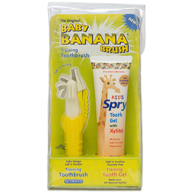 Bàn chải đánh răng mềm Baby Banana từ Live-Right, được kết hợp với Spry Training Tooth Gel với xylitol tự nhiên từ Clean, Inc. Bàn chải đánh răng là silicone 100% (đáp ứng tất cả các tiêu chuẩn thử nghiệm của CPSIA). Thiết kế an toàn hơn với tay cầm có thể uốn được cấp bằng sáng chế và máy rửa chén an toàn. Gel Spry Tooth là an toàn để nuốt, không chứa chất florua, nếm thử hương vị quả chuối, tất cả các thành phần tự nhiên. Gel cung cấp các lợi ích đã được chứng minh lâm sàng của xylitol để cung cấp canxi canxi làm tăng cường răng và bảo vệ và tăng cường răng phát triển. Cả hai sản phẩm đều được nha sĩ và nhân viên vệ sinh khuyên dùng. 12 tháng trở lên.